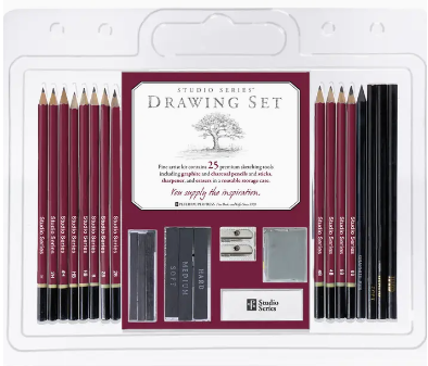 Ideal for novices, dabblers, and seasoned artists alike, the Studio Series Drawing Set contains 25 essential sketching tools, all in one handy reusable storage case. You supply the inspiration! Comprehensive drawing set includes: 12 graphite pencils (5H-8B). 3 charcoal pencils (soft, medium, hard). Soft graphite sketching pencil. 3 charcoal sticks (soft, medium, hard). 3 graphite sticks (soft, medium, hard). Sharpener for graphite pencils & charcoal pencils. Kneaded eraser. Plastic eraser. Reusable storage case keeps everything safe and organized on the go. Case measures 11-3/4'' wide x 10-1/2'' high x 1/2'' deep.