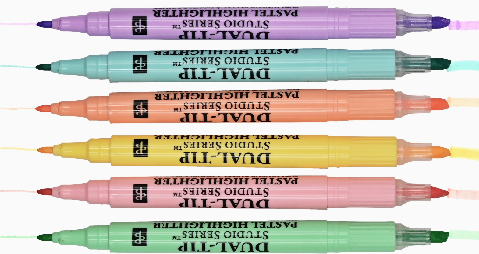 Beautiful pastel highlighters won't smudge or bleed, even through the thinnest of pages! Set of 6 highlighters. Versatile dual tips. Broad chisel tip for highlighting. Narrow tip for underlining. Uniquely formulated waxy highlighters are bleed- and feather-resistant, even on thin pages in Bibles, magazines, textbooks, and more. Vibrant fluorescent pigment ink. Pastel pink, orange, yellow, green, blue, and violet. Easy-on-the-eye pastels are perfect for planners, handwritten notes, documents, and so much more! Each highlighter measures 5-1/2'' long. Durable, reusable plastic case with snap-top opening keeps your highlighter set safe and organized on the go. Snap-top serves as a handy stand, too. Case measures 3-1/4'' wide x 6'' high.