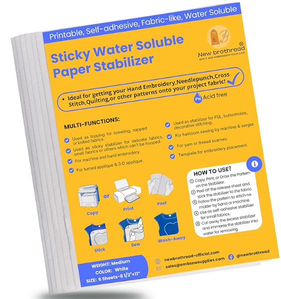 - Sticky Water Soluble Paper Stabilizer is ideal for getting your hand embroidery, needle punch, cross stitch, quilting or other patterns onto your project fabric. Print, copy, or draw your design on it; then peel off the release sheet and stick the design in place for hand or machine embroidery;then rinse away when finished!